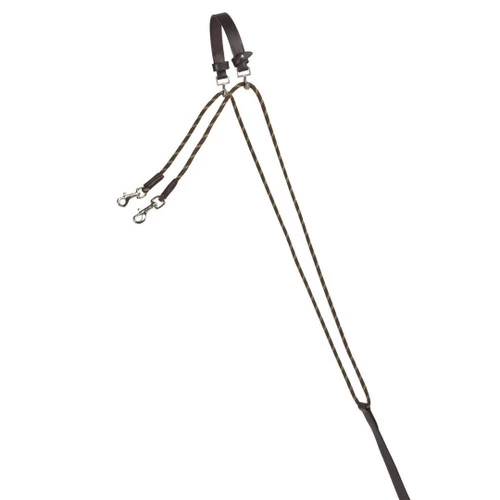 Camelot Chambon for horse training. A chambon encourages a more correct head and neck position without forcing the horse into an unnatural frame. The chambon attaches to the crown of the bridle and the center strap runs to the girth and attaches with a snap. The ropes go through rings at the crown then down to the bit, where the ends attach with snaps. The horse’s head and neck respond to the application of poll pressure when the horse is asked to drop his head and relax into the bridle. Brown leather with nylon cord and stainless hardware.