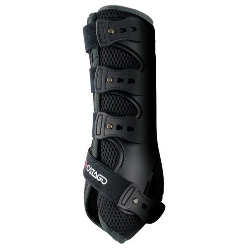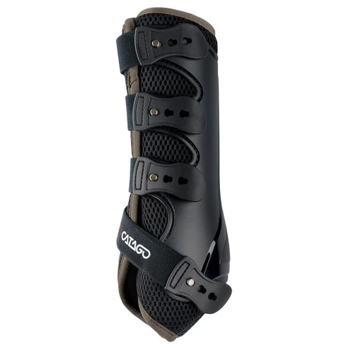 Highly ventilated CATAGO dressage front boots have a hard shell that protects against impacts. The interior is a soft mesh material with the FIR-Tech fibers. The full coverage ventilated horse boot for dressage allows excess heat to escape. The far infrared waves do not heat up or irritate the skin; they penetrate tissues to increase blood flow. CATAGO FIR-Tech Dressage Boots have four elastic straps with hook stud closures. One Pair, in elegant CATAGO colors Urban Chic and Walnut Brown.