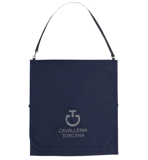 Cavalleria Toscana Water Resistant Bandage Carrier has a detachable shoulder strap. The strap has clips on both ends so you can secure it multiple ways in the tack room, trailer, or at the shows. The large flap protects the bandages and can be folded back while accessing the interior. There is an individual pocket for each bandage and room storage for quilt wraps or flannels. Handsome Bandage Carrier is stamped in front with Cavalleria Toscana and the CT logo.