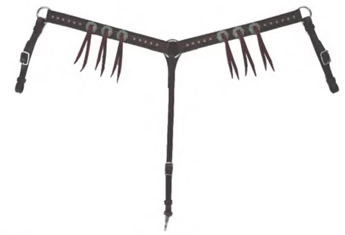 The Remuda Breast Collar from Circle Y is a stand out with just the right amount of embellishment and a traditional look. Great looking Circle Y Remuda Breast Collar in warm Walnut has antique copper parachute dots and conchos. The antique treatment adds an authentic turquoise tint that is beautiful against the dark leather.