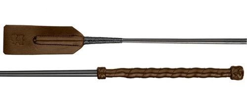 Döbert Big Flap Leather Crop has a flexible nylon core and a long, wide keeper end. The Big Flap Leather Crop has a smooth nylon shaft (not covered in fabric) in black while the tip and wavy grip are chocolate brown leather. The shaft has a brand sticker in silver lettering.