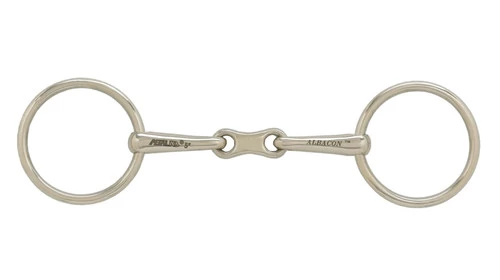Albacon loose ring bradoon with french link mouth. 13mm mouth, 55mm rings. Made of high-copper form of German Silver to stimulate salivation and prevent dry mouth, with the same appearance as German Silver. Sizes: 5.25, 5.5, 5.75, 6.