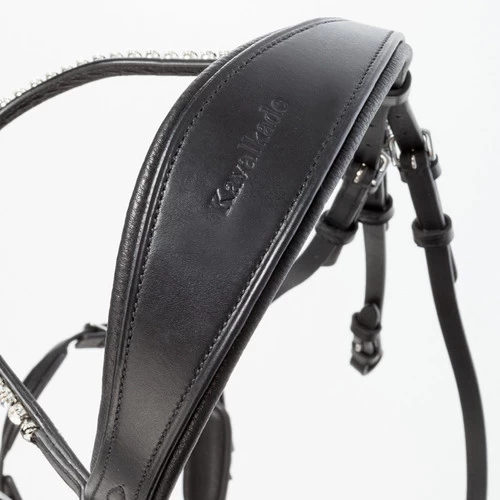 Kavalkade Fiala Drop Noseband Bridle in fine black leather has a padded drop noseband and comfortable anatomical crown. The clean design flatters your horse’s face while the stunning crystal browband adds a pop of glamour.
