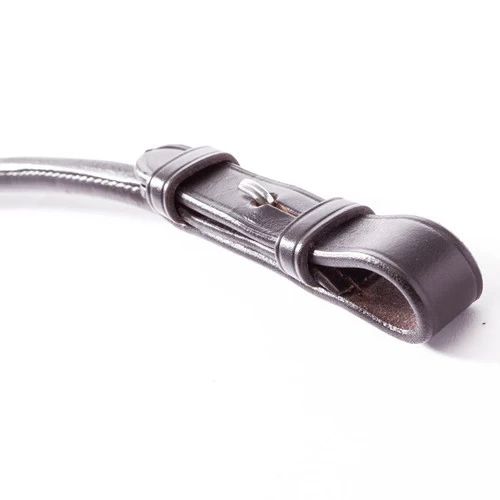 Kavalkade Rolled Rubberized Reins have a more traditional look than rubber grip reins, and even more so with the beautiful round stitched fronts. Full size 5/8″ reins are black or brown German leather and have hook-stud ends and stainless steel hardware.