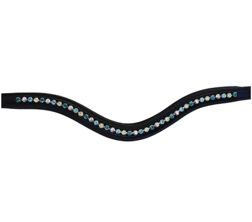 KL Select Paradise Curved Browband in black leather adds an elegant touch to your horse’s dressage bridle. Lovely black leather browband has a center row of sparkling crystals in Teal, Aqua, Light Pink, and Light Yellow. It is softly padded for comfort.