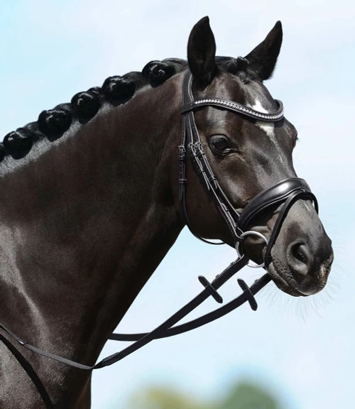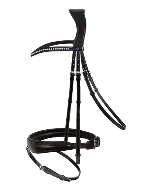 PASSIERBLU black dressage snaffle bridle has clear crystals on the narrow curved browband and stainless steel fittings. Not just ordinary crystals, Passier chose Silver Clear Swarovski Strass crystals for the most sparkle and shine. Ergonomic PASSIERBLU Spirit Snaffle Bridle will fit the horse’s head with maximum comfort and achieves a beautiful look. The Spirit Snaffle from Passier comes complete with hook stud web reins with leather grips and stops.