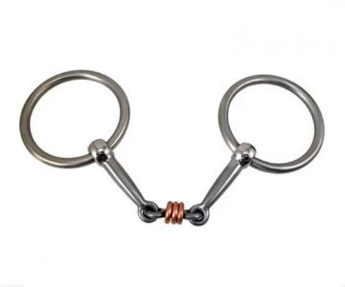 Tom Balding Three ‘N One Loose Ring Bit with copper rings is a good snaffle bit option for nervous horses and those needing a bit more tongue pressure. This sweet iron western bit has a center link with three copper roller rings added for soothing and encouraging the production of saliva. The increased saliva allows the bit to move and function optimally. The copper rollers also spread across the tongue which increases tongue pressure as well as leverage on the bars. Three ‘N One Loose Ring from Tom Balding is a handy bit to have in your training arsenal, especially for those horses with a busy mouth.