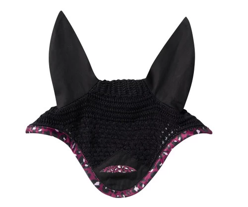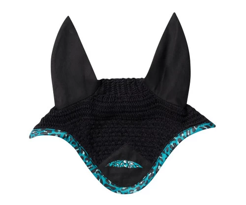 Stylish WeatherBeeta Prime Leopard Ear Bonnet takes a classic horse accessory and makes it fun and unique. High quality crochet ear net in black has black cotton twill ears. The front panel has the WeatherBeeta umbrella emblem in leopard print to match the binding.
